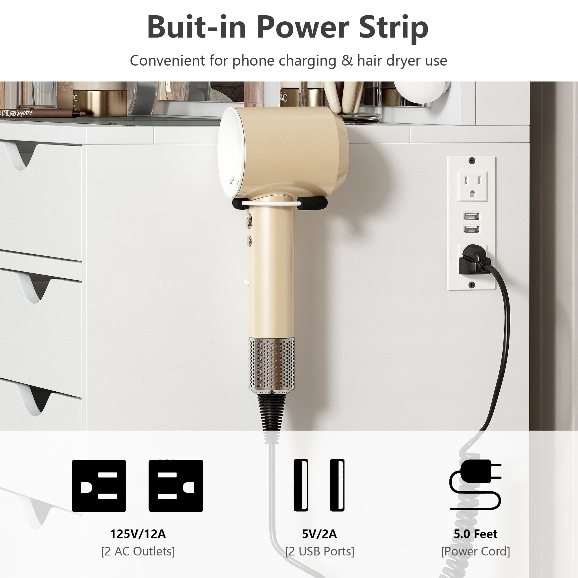 - Vanity Come with Power Outlet: Vanity Table comes with a hair dryer stand and power outlet; Charging station includes 2 standard plug sockets and 2 USB ports to connect your hair dryer, curling iron, computer, cell phone, ipad and other devices, so that all activities can be carried out on this vanity table