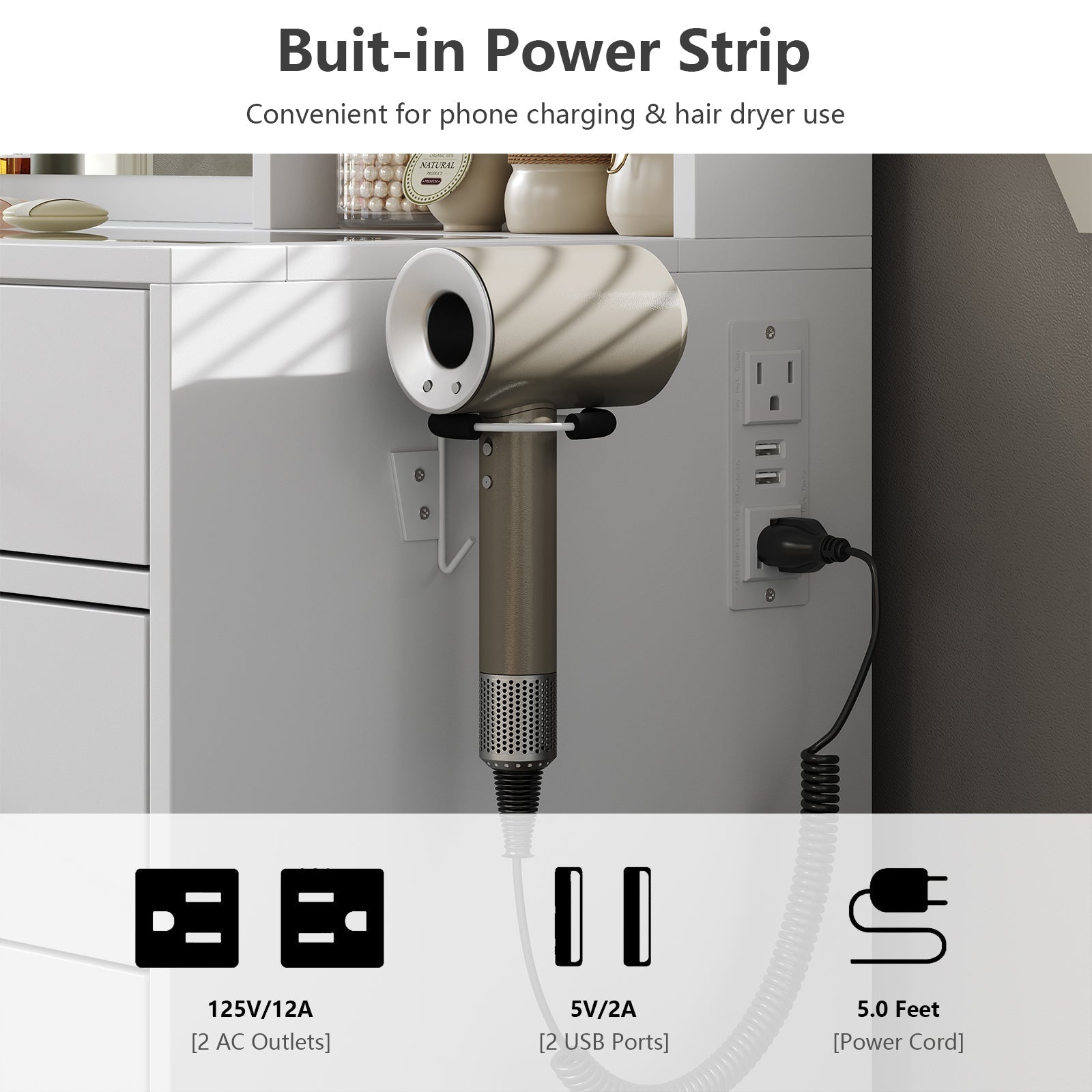 - Vanity Table with Charging Station: This Vanity comes with a hair dryer stand and charging station, including 2 standard plug sockets and 2 USB ports to connect your hair dryer, curling iron, computer, Ipad, mobile phone, allowing you to take beautiful selfies after applying makeup